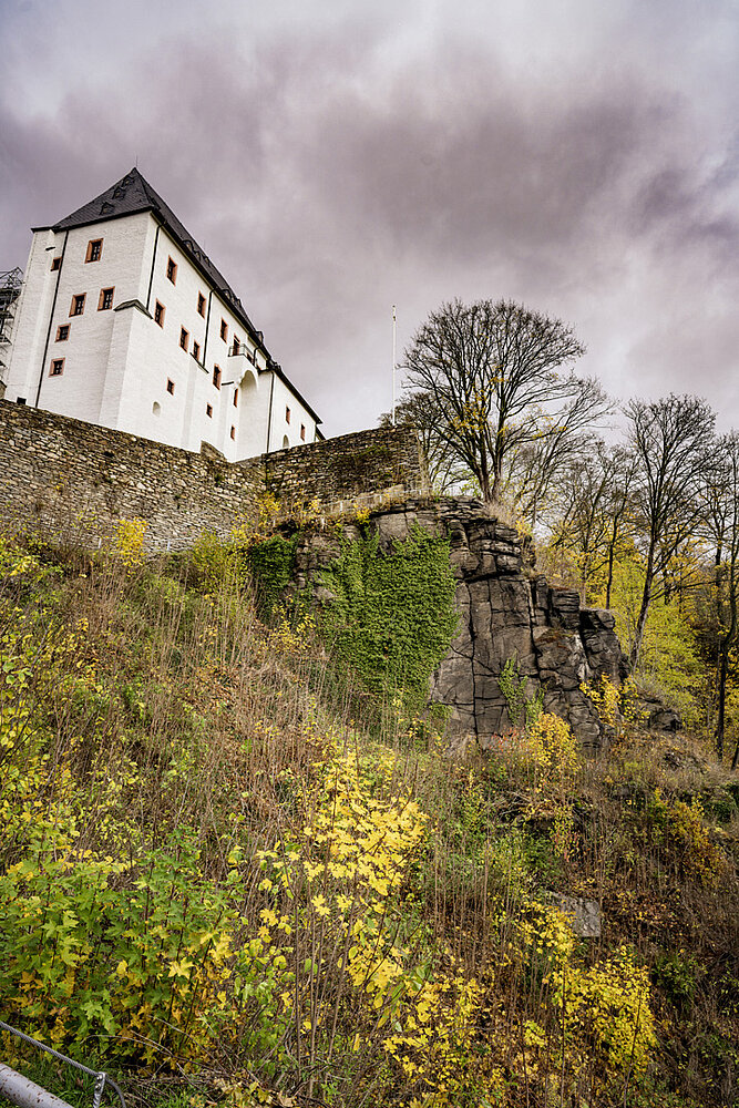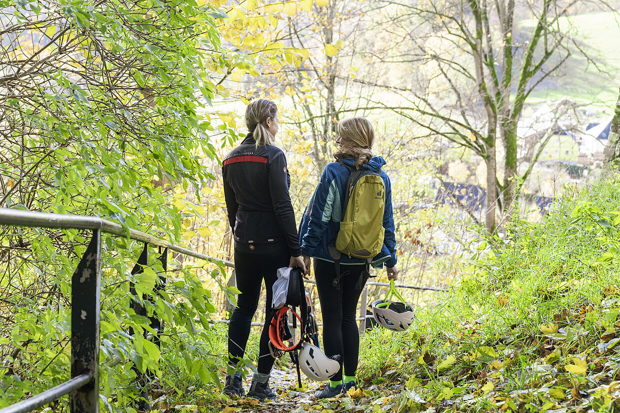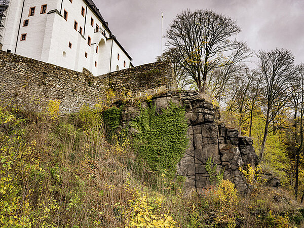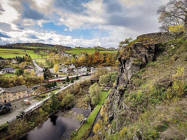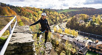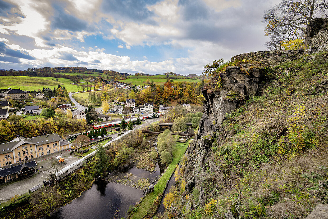 Unterhalb des Wolkensteiner Schlosses gibt es zwei Klettersteige: den Wolfspfad als leichte Querung und den steilen Hag zum Schloss hinauf. Beide liegen oberhalb des Flusses Zschopau und sind großzügig mit Trittbügeln versehen. Der Hag endet an der Schlossmauer und bietet eine atemberaubende Aussicht auf die Landschaft und den Wolkensteiner Bahnhof. So, als würde man auf eine Modellbahnanlage schauen.