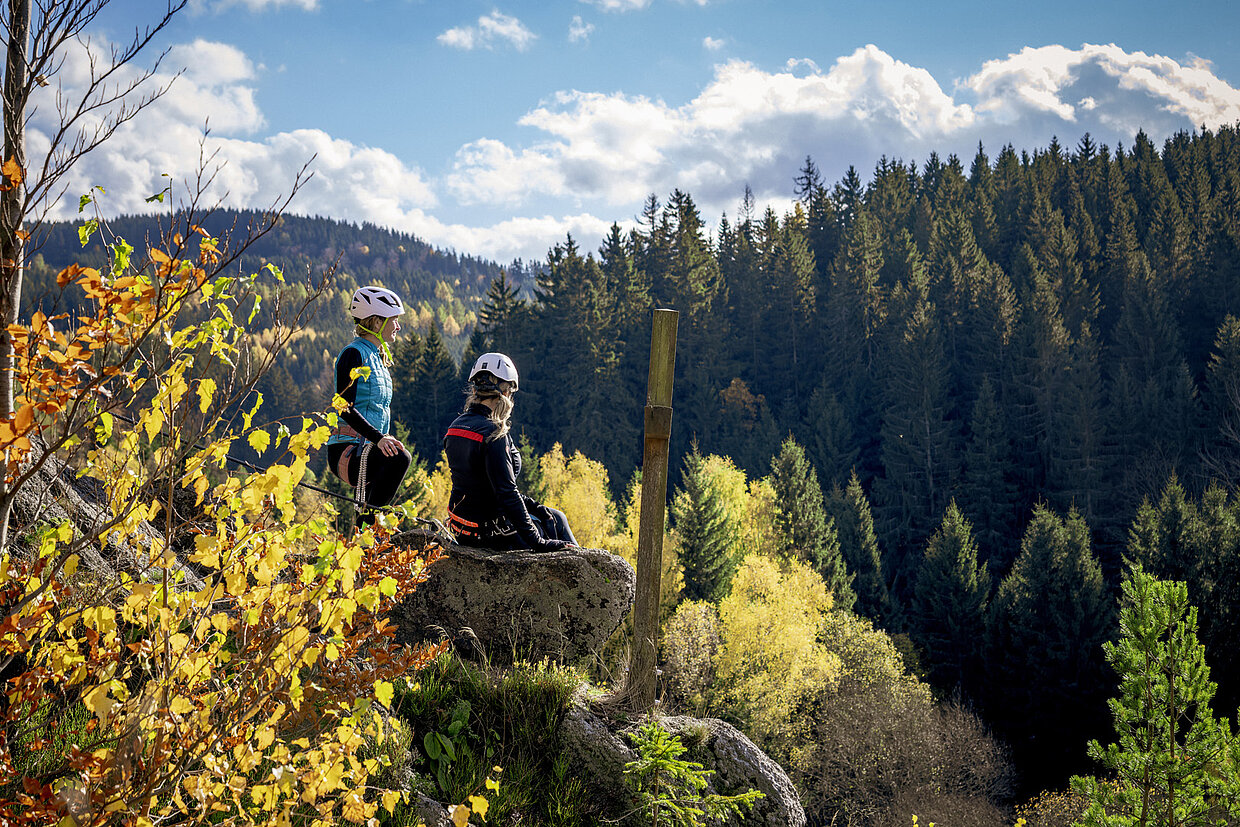 Mitten im malerischen Schwarzwassertal liegt das Katzensteinklettergebiet. Für Erfahrene, die mit mobilen Sicherungen umgehen können, ist es sehr lohnenswert: abwechslungsreiche Landschaft, spektakuläre Ausblicke und intensives Naturerlebnis. Nur ausgewählte Felsen sind im Naturschutzgebiet freigegeben: Silberwand, Teufelsmauer, Wildschütznadel, Nonnenfelsen, Katzensteinnadel und Goldkrone. Der feste Gneis hat meist gute Struktur und Griffigkeit. Die Routenvielfalt reicht von klassisch bis anspruchsvoll. Besonders die Goldkrone bietet Herausforderungen im Schwierigkeitsgrad 7–8. Vom Nonnenfelsen und der Katzensteinnadel gibt es die schönsten Ausblicke über das Schwarzwassertal. Im Gebiet finden sich alle Schwierigkeitsgrade, jedoch ist die Absicherung größtenteils gering, die meisten Routen müssen traditionell geklettert werden. Im Sommer kann man sich in der „Schwarzen Pockau“ erfrischen.