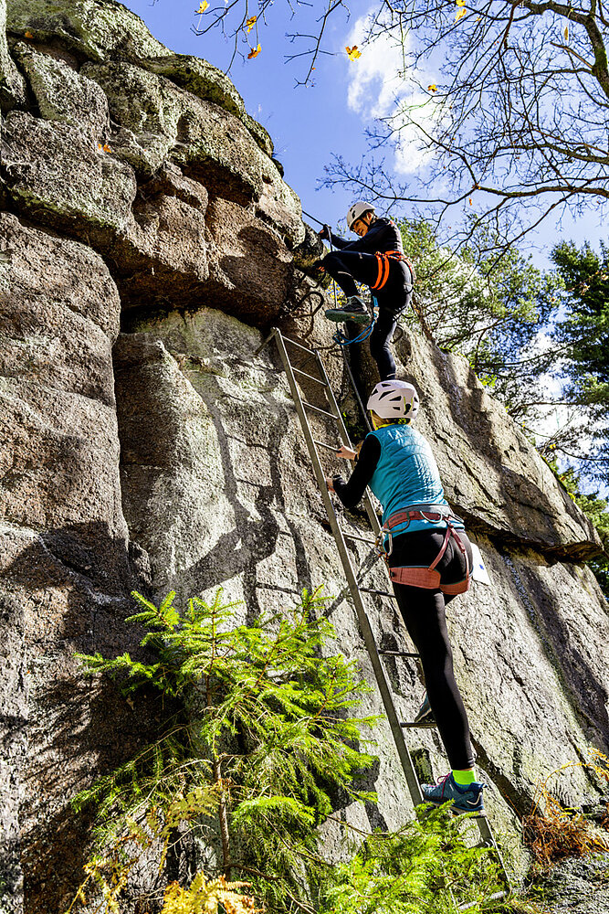 Die Formation aus Turmalingranit ist eindrucksvoll, der Panoramablick wunderbar. Nach dem Einstieg über eine Leiter verläuft die gut gesicherte Route in steilem Gelände und ist teils etwas überhängend. Dann folgt eine lange Querung, bevor man gerade hinauf zum Gipfelbuch steigt. Das steile Finale führt zum Gipfelkreuz. Zum Abstieg geht es zur Burma-Seilbrücke und über die Abstiegsvariante in Schwierigkeit D (nur für Geübte) senkrecht bis leicht überhängend ca. zehn Höhenmeter hinab. Ein früherer Ausstieg ist vor der Brücke möglich. Für Steig ein bis zwei Stunden Zeit einplanen.